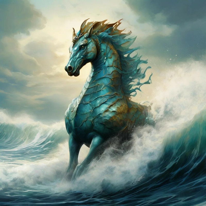 Морська істота: передня частина — кінь, задня — риба. За міфами, він жив у морі та допомагав богу Посейдону.
